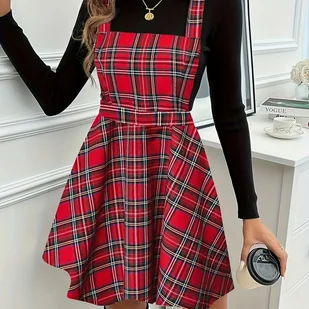 TEMU Elegancka Czerwona Sukienka w Kratę z Szelkami dla Kobiet, Modna i Temperamentna, Sukienka na Walentynki