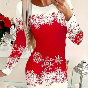 TEMU Elegancka czerwono-biała sukienka świąteczna z nadrukiem płatków śniegu dla kobiet