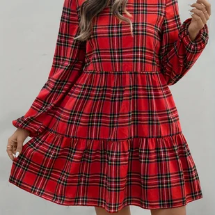 TEMU Elegancka czerwono-czarna koszulka w kratkę dla kobiet - długie rękawy, guziki, falbany, okrągły dekolt, idealna na wiosnę/leto, swobodna