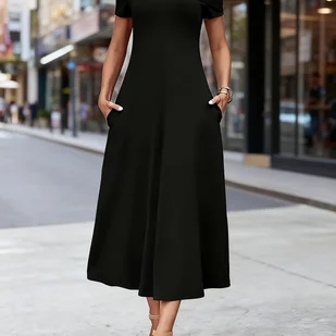 TEMU Elegancka damska sukienka midi | Dekolt w kształcie litery V, półrękaw | Silueta w kształcie litery A z kieszeniami | Jednokolorowa, czarna |