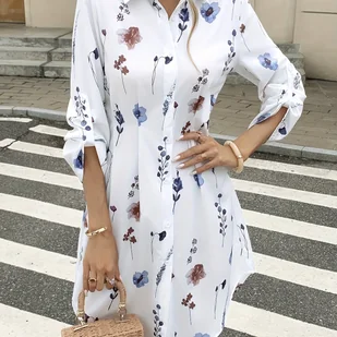 TEMU Elegancka i żywa sukienka-koszula we wzory kwiatowe idealna na wakacje.