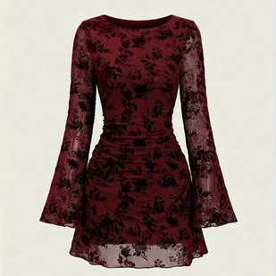 TEMU Elegancka Vintage Sukienka Damska z Długim Rękawem, Rozkloszowana, Dopasowana, z Aksamitnym Wykończeniem, Tkanina na Jesień