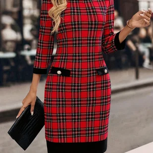 TEMU Elegancka Mini Sukienka w Kratę Damska Tunika Jesienno-Zimowa z Okrągłym Dekoltem, Detale w B Kolorów, Idealna do Dojazdów do Pracy i na
