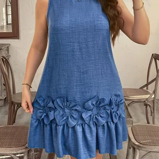 TEMU Elegancka sukienka tunika bez rękawów z detalem falbanek - okrągły dekolt, jednokolorowy, lekki poliestr dla kobiet, idealny na letni modny,