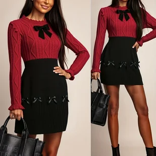 TEMU Elegancka Zimowa Sukienka Damska z Falbanką i Koronkowym Kołnierzem – Długi Rękaw, A-Line, Dopasowana, Okrągły Dekolt, Jednokolorowa (Bez Wzoru)