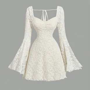 TEMU Kobieca Biała Koronkowa Sukienka z Rozszerzanymi Rękawami, Noworoczna Sukienka dla Kobiet, Letnia Sukienka na Przyjęcie Herbaciane, Biała
