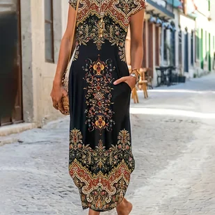 TEMU Kobieca Casualowa Sukienka z Geometrycznym Wzorem – Okrągły Dekolt, Długa Koszulka w Stylu T-Shirt do Każdej Pory Roku, Kolorowe Akcenty na ,