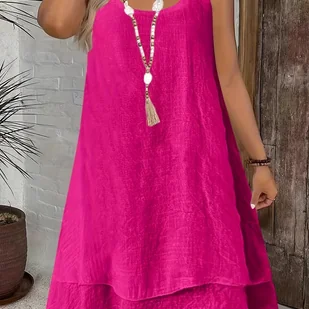 TEMU Kobieca Elegancka Sukienka Plażowa Bez Rękawów z Dekoltem w Serek - Luźny Krój, Podwójna Warstwa na Dołku, Okrągły Dekolt Jednokolorowy na