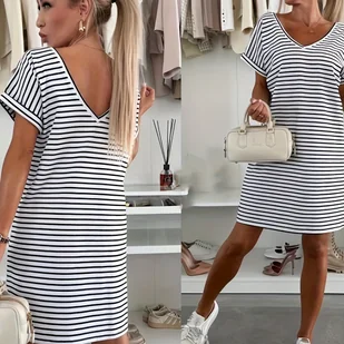 TEMU Koszulka-sukienka dla kobiet w czarno-białe paski z dekoltem serduszkiem - luźny krój, krótkie rękawy, letnia sukienka o średniej elastyczności,