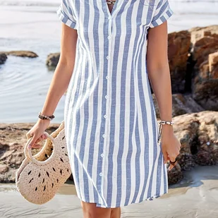 TEMU Letnia Sukienka Damska z Krótkim Rękawem, Dekoltem w Serek, w Paski, do Kolan
