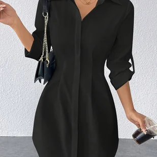 TEMU Letnia Sukienka w Stylu Koszuli, Dopasowana, Jednokolorowa, Okrągły Dekolt, Damska Odzież