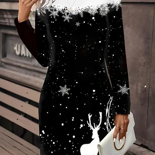 TEMU Navidad Jesień i Damska Sukienka z Nadrukiem Świątecznym, Czarna z Długimi Rękawami, Uniwersalna Obcisła Sukienka na Imprezy, Domowe Ubrania i