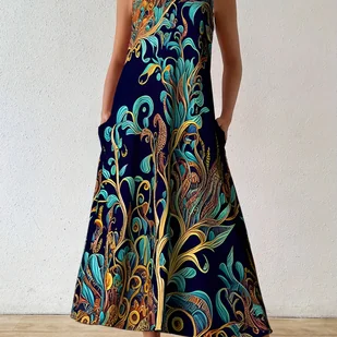 TEMU Sukienka A-Line bez Rękawów z Kieszeniami i Zamkiem - Żywa Turkusowo-Złota na Granatowym Tle, Lekka, Pralna w Pralce Wiosenna/Letnia, Okrągły