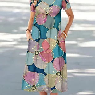 TEMU Sukienka A-Line z Kieszeniami - Wielokolorowy Okrągły Dekolt, Elastyczna, Pranie w Pralce, Całoroczna Elegancka Sukienka Damska, Urocze Stroje