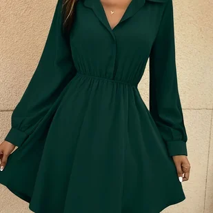 TEMU Sukienka damska z kołnierzykiem i półzapięciem z przodu – krótki lub średni rękaw, dopasowany stanik i szeroka, jednokolorowa sukienka do prania