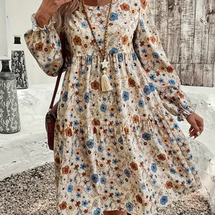 TEMU Sukienka Maxi z Falbanką i A-Linii - Długi Rękaw, Okrągły Dekolt, Luźny Krój, Pranie w Pralce, Całoroczna Casualowa Sukienka na Wakacje, Bez