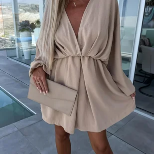 TEMU Sukienka z Dekoltem w Serek, Długi Rękaw, Wygodna i Dopasowana, Jednokolorowa