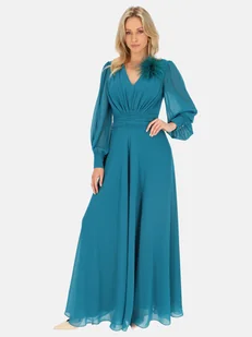 Elegancka maxi sukienka wieczorowa w turkusowym kolorze z broszką