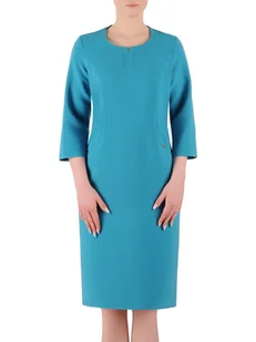 Delikatna i ponadczasowa, ta turkusowa sukienka midi zachwyca swoją prostotą i elegancją. Ozdobnie wycięty okrągły dekolt subtelnie podkreśla szyję, nadając stylizacji szyku, a dopracowane przeszycia modelują sylwetkę, tworząc efekt wysmuklenia. Rękawy 3/4 sprawiają, że kreacja jest idealna na wiosenne i letnie uroczystości, takie jak komunia czy rodzinny obiad. Długość sięgająca do kolan zapewnia wygodę i odpowiedni poziom formalności, dzięki czemu sukienka doskonale sprawdzi się na spotkania w gronie najbliższych. Wysokiej jakości tkanina gwarantuje komfort noszenia przez cały dzień, a głęb