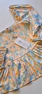 VILA bluzka damska w rozmiarze M dopasowana baskinka rękawki bufki dół wykończony baskinką wielokolorowa motyw kwiaty 95% poliester, 5% elastan Produkt nowy ...