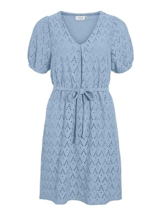 Sukienka "Amalina" w kolorze błękitnym - z dodatkiem poliestru pochodzącego z recyklingu - dekolt: V - rękaw: bufiasty - zdejmowany pasek: tkanina - krój: prosty - wzór: dziurkowany