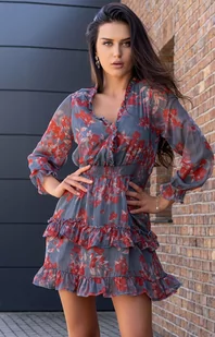 - kobieca sukienka z falbanami - gumka w pasie i na rękawach - dekolt ozdobiony falbanką