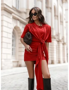 Wiskozowa sukienka mini z wiązaniem NAOYA - czerwona Pozwól sobie na odrobinę nonszalanckiej elegancji – sukienka mini z wiskozy to modowa perełka, obok której trudno przejść obojętnie. Uszyta z przyjemnego, elastycznego materiału pięknie dopasowuje się do sylwetki, podkreślając kobiece kształty, a marszczenia, poduszki w ramionach i ozdobne wiązanie z przodu dodają całości charakteru. Efekt "drapowania" optycznie wysmukla talię i biodra, tworząc spektakularny efekt bez wysiłku. Krótkie rękawy oraz długość mini równoważą mocny akcent wiązania, nadając stylizacji lekkości. To model idealny na wieczorne wyjścia, randki, imprezy lub eventy z modowym dress codem.
