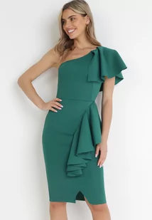 Zielona Dopasowana Sukienka na Jedno Ramię z Falbanami Lelila
