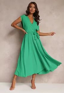 Zielona Rozkloszowana Sukienka Maxi z Kopertowym Dekoltem i Wiązanym Paskiem Hallona