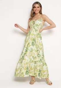 Zielona Sukienka z Wiskozy i Bawełny Rozkloszowana w Kwiatowy Print z Ozdobnym Wiązaniem Wiama