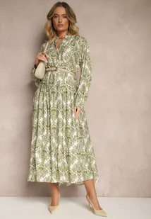 Zielona Rozkloszowana Sukienka z Wiskozy w Ornamentalny Wzór Gonavina