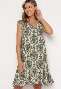Zielono-Beżowa Bawełniana Sukienka w Stylu Boho na Ramiączkach z Falbanką Zaelle