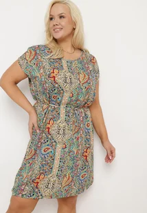 Zielono-Beżowa Wiskozowa Sukienka w Stylu Boho o Pudełkowym Kroju z Materiałowym Paskiem Neteri