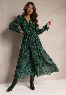 Zielono-Czarna Sukienka Maxi Rozkloszowana z Kopertowym Dekoltem Bramave