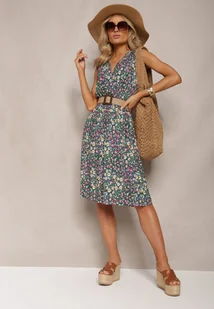 Zielono-Różowa Rozkloszowana Sukienka z Wiskozy Midi w Kwiaty z Kopertową Górą Pervia