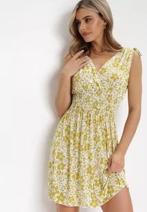 Żółta Sukienka Mini z Gumkami w Pasie i Kopertowym Dekoltem w Kwiaty Ladgerda
