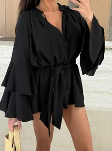 CECHY PRODUKTU: Sukienka mini Długi rękaw Głęboki dekolt "v" Pasek wiązany w pasie Ozdobne wiązania Zwiewny krój Lejący materiał