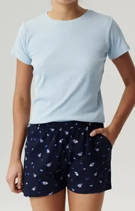 Atlantic piżama damska NLP-490/01-NIM_GRA to stylowa i wygodna propozycja na cieplejsze noce idealna na wiosnę i lato. Zestaw łączy subtelną estetykę z funkcjonalnością, zapewniając maksymalny komfort snu. Piżama składa się z dopasowanej, prążkowanej koszulki w delikatnym błękitnym odcieniu. Koszulka ma krótkie rękawy oraz okrągły dekolt, który miękko układa się przy szyi i zapewnia swobodę ruchów. Do kompletu dołączone są granatowe szorty z uroczym nadrukiem w motyle, wyposażone w kieszenie po bokach i elastyczną gumę w talii wygodną, nieuciskającą i dopasowującą się do sylwetki.