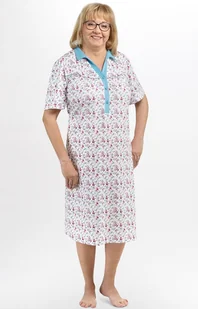Bawełniana koszula nocna damska Jagna I 207 02 to elegancki i komfortowy wybór dla kobiet, które cenią jakość i wygodę. Wykonana z 100% bawełny z certyfikatem Oeko-Tex Standard, zapewnia bezpieczeństwo i komfort przez całą noc. Polski producent MARTEL zadbał o detale, oferując koszulę z luźnym, niekrępującym ruchów krojem oraz długością za kolano, co zapewnia swobodę poruszania się. Model posiada krótki rękaw, dekolt w szpic z kołnierzem oraz rewers zapinany na trzy guziki, co czyni go praktycznym i eleganckim wyborem. Koszula w kolorze niebieskim z kwiatowym wzorem to połączenie delikatności