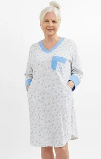 Bawełniana koszula nocna damska Nina II 242 02 to stylowa i komfortowa propozycja od polskiego producenta MARTEL, wykonana z wysokiej jakości 100% bawełny z certyfikatem Oeko-Tex Standard, zapewniającej bezpieczeństwo i wygodę; posiada długi rękaw, dekolt w szpic, luźny niekrępujący ruchów krój, długość za kolano, kieszeń na piersi oraz dwie boczne kieszenie, dostępna w kolorze niebiesko-białym z subtelnym roślinnym wzorem, co czyni ją eleganckim i funkcjonalnym wyborem na noc.