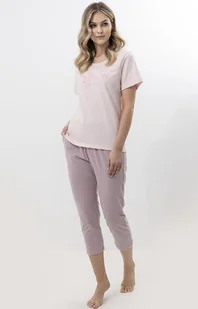 Bawełniana piżama damska 321/02 to klasyczny model, który łączy minimalistyczny design z funkcjonalnością. Góra to jednolita koszulka typu basic na krótki rękaw, ozdobiona subtelnym napisem, który dodaje jej uroku. Spodnie w gładkim kolorze, wyposażone w praktyczne kieszenie, mają długość 7/8 i prostą nogawkę, co zapewnia swobodę ruchów i wygodę noszenia. Całość wykonana z miękkiej, wysokiej jakości bawełny, idealnie nadaje się zarówno do snu, jak i domowego wypoczynku. To świetny wybór dla kobiet ceniących prostotę, elegancję i komfort.