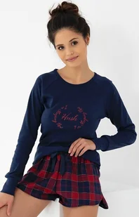 Bawełniana piżama damska Clarissa składa się z koszulki wykonanej z wysokiej jakości dzianiny z długim rękawem, ozdobionej z przodu jednokolorowym haftem. Do kompletu dołączone są krótkie spodenki z flanelowej tkaniny w kratkę, wzbogacone połyskującą nitką lurex. W pasie spodenek znajduje się wiązana taśma, umożliwiająca regulację obwodu i zapewniająca komfort noszenia.