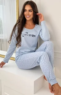 Bawełniana piżama damska długa błękitna Star to propozycja łącząca wygodę i subtelny styl. Wyprodukowana w Polsce z najwyższej jakości bawełny, zapewnia komfort snu oraz swobodę ruchów. Delikatna kolorystyka w połączeniu z modnym nadrukiem na bluzce i spodenkami w gwiazdki tworzy pełen uroku komplet na każdą noc.