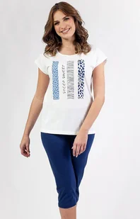 Bawełniana piżama damska granatowa 701 to idealny wybór dla kobiet, które cenią sobie komfort i subtelny styl. Wykonana z wysokiej jakości, miękkiej bawełny, jest przyjemna dla skóry i zapewnia pełną wygodę noszenia. Koszulka z krótkim rękawem posiada półokrągły dekolt, który nadaje całości klasyczny i uniwersalny wygląd. Na wysokości piersi umieszczona została kolorowa grafika, która dodaje piżamie uroku i oryginalności. Do kompletu dołączone są jednolite spodnie typu rybaczki, które są praktyczne i wygodne.