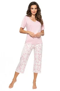 Bawełniana piżama Rosalia 3/4 ma dłuższe nogawki i wygodny krój z krótkimi rękawami. Piżama wykonana jest z wysokiej jakości 100% bawełny. Koszulka od piżamy ma dekolt w kształcie litery V i krótkie rękawy, które są lekko przedłużone. Jest w kolorze różowym. Spodnie od piżamy mają kwiatowy wzór i są w kolorze białym i różowym.