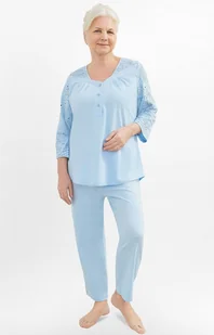 Bawełniana piżama damska Rozalia II 230 04 rękaw 3/4 to elegancka dwuczęściowa piżama, która łączy wygodę z subtelnym stylem. Wykonana w 100% z bawełny z certyfikatem Oeko-Tex Standard, zapewnia bezpieczeństwo i komfort noszenia. Piżama pochodzi od polskiego producenta Martel, co gwarantuje wysoką jakość wykonania. Piżama posiada krótki rękaw 3/4 ozdobiony geometrycznymi wzorami, które dodają jej nowoczesnego charakteru. Spodnie o długości 7/8 są zakończone wygodnym mankietem, a w pasie wszyta jest elastyczna guma, zapewniająca komfort i odpowiednie dopasowanie.