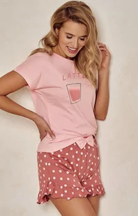 Bawełniana piżama damska różowa Frankie 3126 składa się z koszuli z krótkim rękawem i krótkich spodenek. Bluzka ozdobiona uroczym nadrukiem z przodu. Spodenki w kontrastującym kolorze ze wzorem w kropki. W pasie ozdobna kokardka. Nogawki obszyte falbanką.