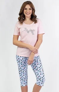 Bawełniana piżama damska różowa niebieska 689 to doskonałe połączenie komfortu i stylu. Wykonana z wysokiej jakości bawełny, zapewnia przyjemność noszenia oraz przewiewność, idealną na każdą porę roku. Koszulka z krótkim rękawem posiada półokrągły dekolt, który dodaje jej klasycznego i kobiecego charakteru. Na wysokości piersi znajduje się subtelna, niewielka grafika, która podkreśla jej uroczy design. Do kompletu dołączone są wzorzyste spodnie typu rybaczki, które zapewniają wygodę oraz oryginalny wygląd.