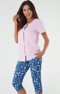 Bawełniana piżama damska różowo-niebieska Lady jest przyjemna w dotyku i nie krępuje ruchów. Bluza posiada krótki rękaw i jest zapinana na praktyczne napy, a delikatny materiał doskonale dopasowuje się do ciała. Spodnie w pięknym wzorze tulipanów dodają całości uroku i kobiecej elegancji. Ich długość sięga 3/4 nogi, co sprawia, że są one zarówno stylowe, jak i wygodne. Dwuczęściowa piżama damska to nie tylko strój na noc, ale także idealna opcja na leniwe poranki i wieczory.