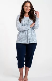 Bawełniana piżama damska Talita idealnie sprawdzi się na cieplejsze noce, zarówno w domowym zaciszu, jak i na wyjazdach. Jej prosty, luźny krój zapewni swobodę ruchów i wygodę, a lekki, oddychający materiał będzie miły dla skóry. Damska piżama ze spodniami i długim rękawem jest rozpinana na całej długości, posiada też zaokrąglony dekolt oraz ozdobne przeszycia, które dodają jej uroku. Ten stylowy komplet do spania, zdobiony motywem ślicznych kwiatów, spodoba się każdej kobiecie.